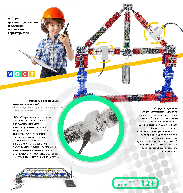 Демонстрационный набор «Фермовые конструкции и разводные мосты» предназначен для сборки моделей мостов, в том числе и разводного моста, экспериментального изучения статики на основе измерения усилий сжатия и растяжения, возникающих в элементах моделях мостов, измерения резонансных частот колебаний моделей мостов и влияния на них геометрических и конструкционных характеристик.