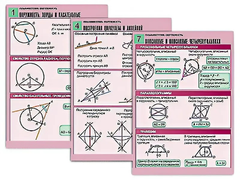 Комплект учебно-наглядных пособий "Планиметрия. Окружность" формата А1 с полноцветной двухсторонней печатью и матовой двухсторонней ламинацией в количестве 8 таблиц.