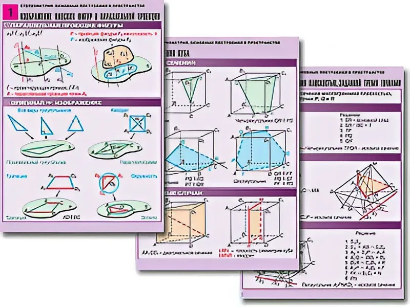 Комплект таблиц по геометрии "Стереометрия. Основные построения в пространстве" (8 таблиц, А1, ламинированные) - fgospostavki.ru - Махачкала