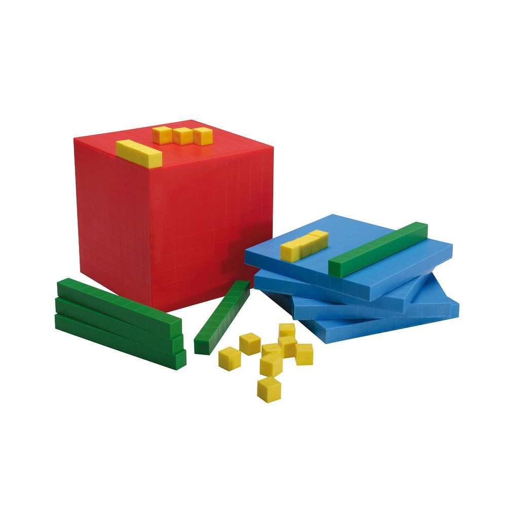 Набор предназначен для демонстрации соотношений между единицами, десятками, сотнями и тысячами. Каждый элемент разделен на кубические сантиметры, что еще более подчеркивает соотношение с разных элементов. В комплекте 100 желтых кубиков (единицы), 50 зеленых (десятки), 30 голубых пластин (сотни) и 4 красных куба (тысячи).