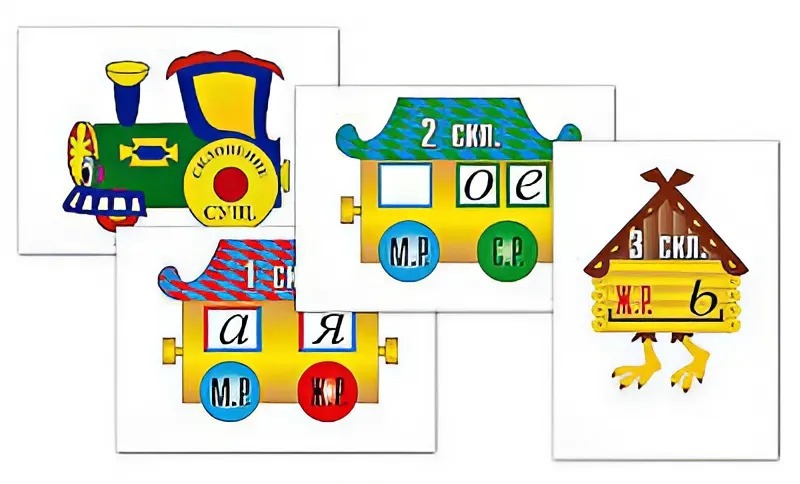 Пособие состоит из 4 полноцветных таблиц формата 27*39 см, ламинированных матовой пленкой. Таблицы посвящены трем склонениям имен существительных, изобразительно объединены темой паровоза и путешествия, что отражается и становится понятным в ходе урока.