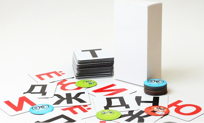 – 71 карточка с буквами на белом фоне и одна пустая карточка, на которой, например, можно написать любую букву. В наборе по три популярных и по две менее популярных гласных (они обозначены красным) и по две согласных (они – чёрные). Твердый и мягкий знаки также обозначены чёрным, их тоже по два.