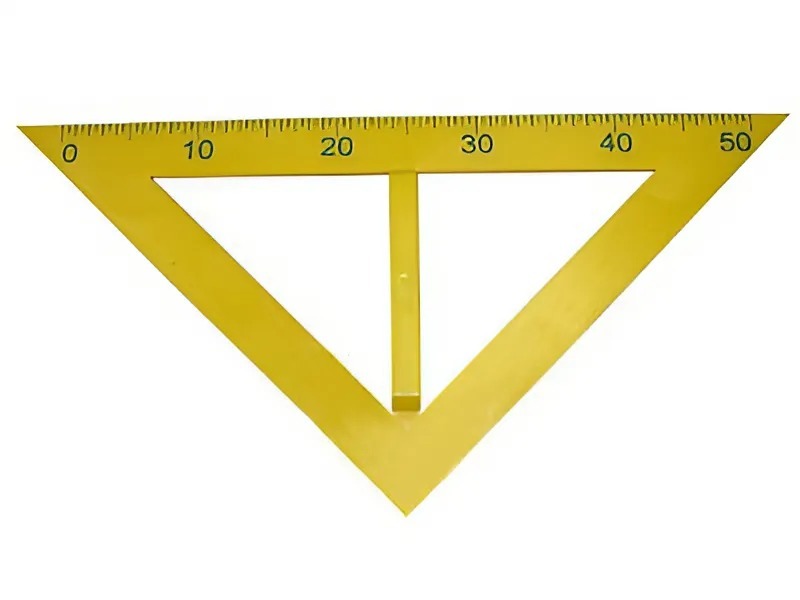 На основание равнобедренного треугольника нанесена шкала (50 см) с ценой деления 0,5 см и оцифровкой через 10 см. Позволяет чертить углы 45, 90 и 135 градусов, перпендикулярные прямые, равнобедренные треугольники и другие геометрические фигуры на классной доске.