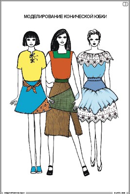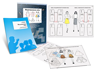 Наглядно-методические материалы комплекта иллюстрируют способы моделирования юбок различных фасонов: клиньевой юбки, прямой юбки, юбки «годе», юбок с кокеткой, рельефами, оборками и т.д.