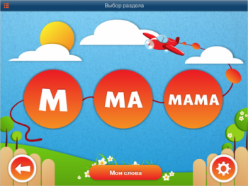 Изучение материала аналогично предыдущему этапу. При проверке полученных знаний пользователю предлагается картинка, под ней подписано название предмета, разбитое на слоги. Вместо последнего слога пустое место. Ниже случайный набор карточек слогов, включая правильный. Пользователь должен подобрать недостающий слог, нажимая на карточки.