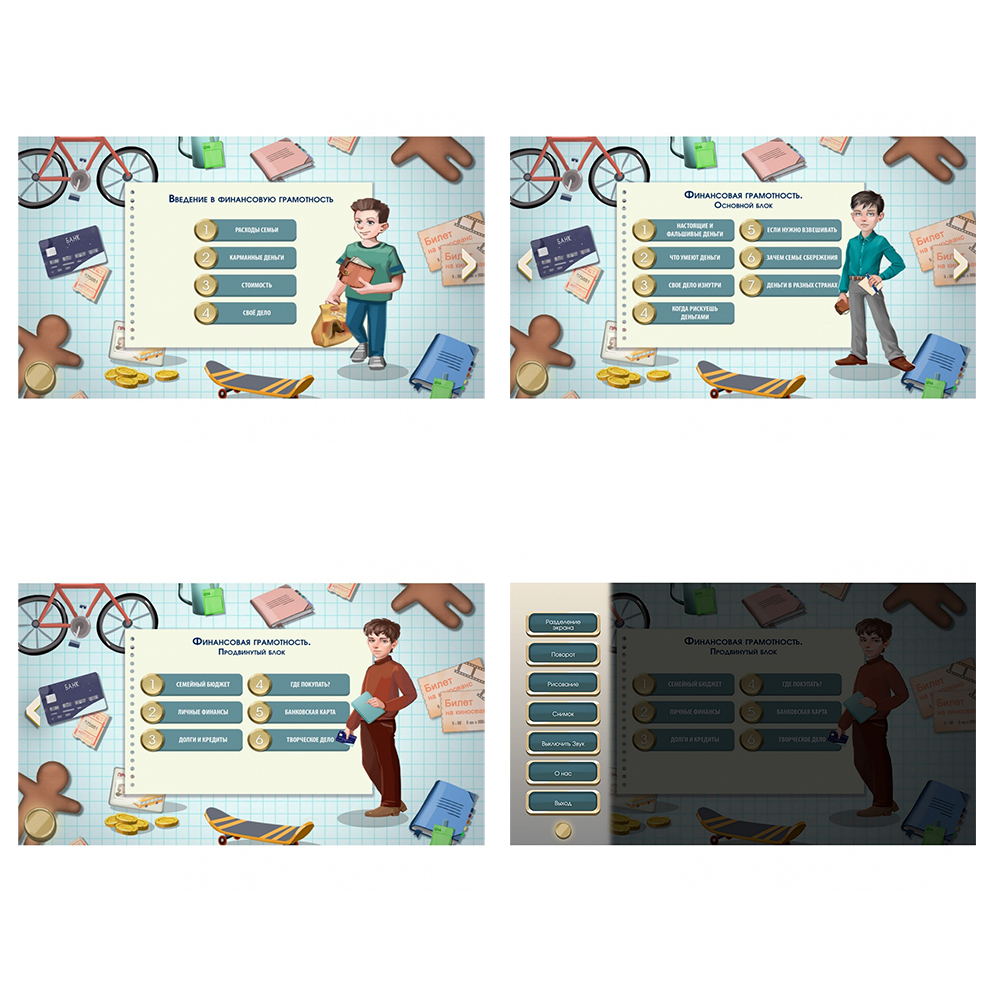 Специализированное программное обеспечение состоит из 4 блоков: введение, начальный, основной и продвинутый, где содержится более 100 аналитических и творческих задач на повышение финансовой грамотности.