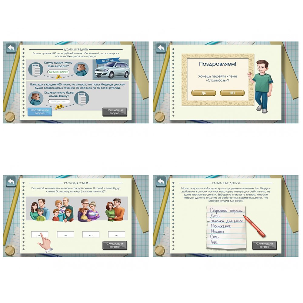 - Продвинутый блок: планирование семейного бюджета, личные финансы, анализ цен, долги и кредиты, банковская карта, творческое дело.