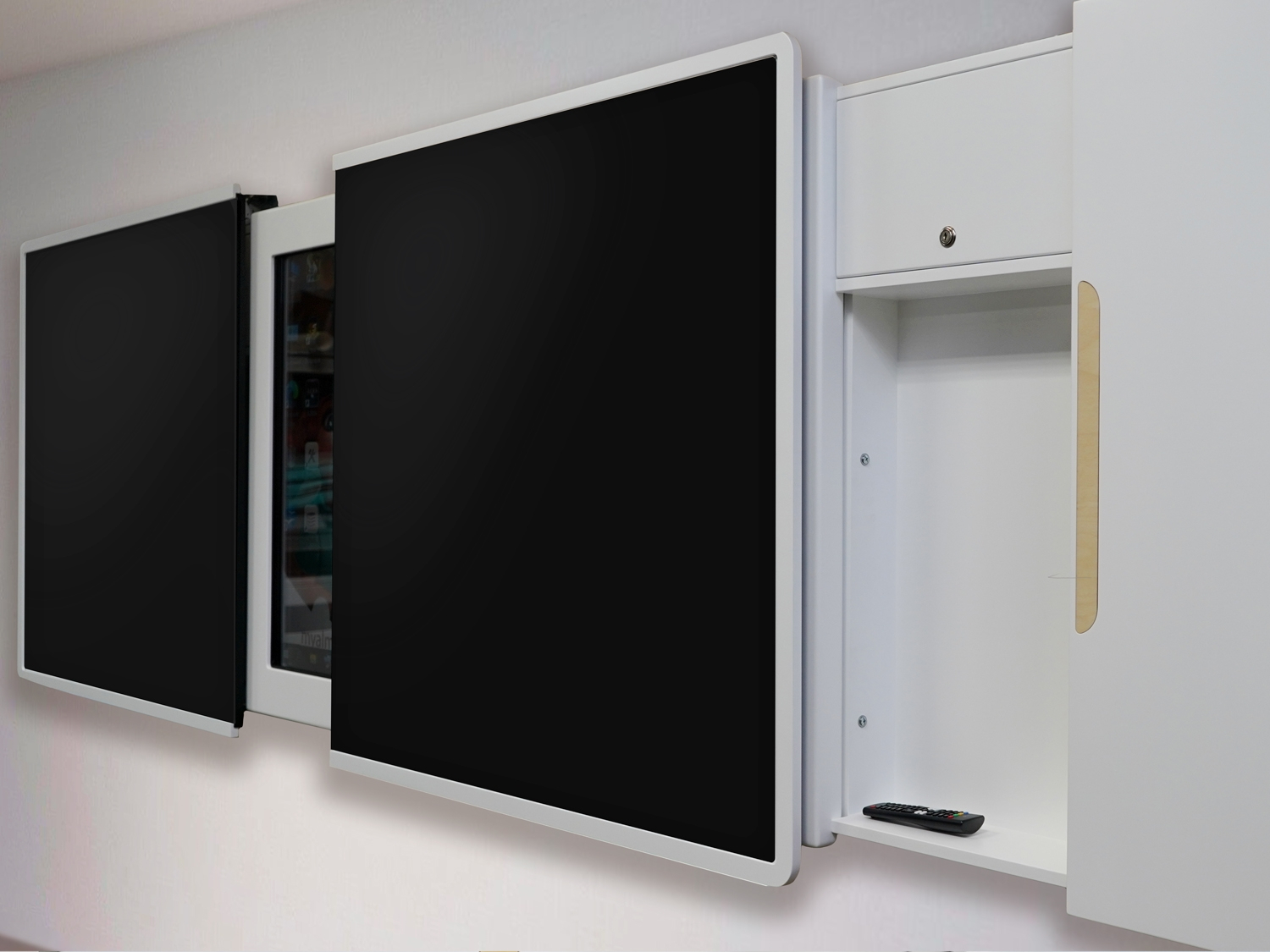 6. Удобство и эргономичность конструкции. Раздвижная система створок имеет прочную конструкцию и плавный ход благодаря доводчикам. По бокам интерактивной раздвижной доски находятся закрытые секции с полочками, где удобно хранить обучающий материал, маркеры, губки, пульты управления и прочий инвентарь. Запирающаяся на ключ секция, куда можно убрать ноутбук преподавателя, становится доступна при максимальном сдвигании двух досок в противоположную от секции сторону.