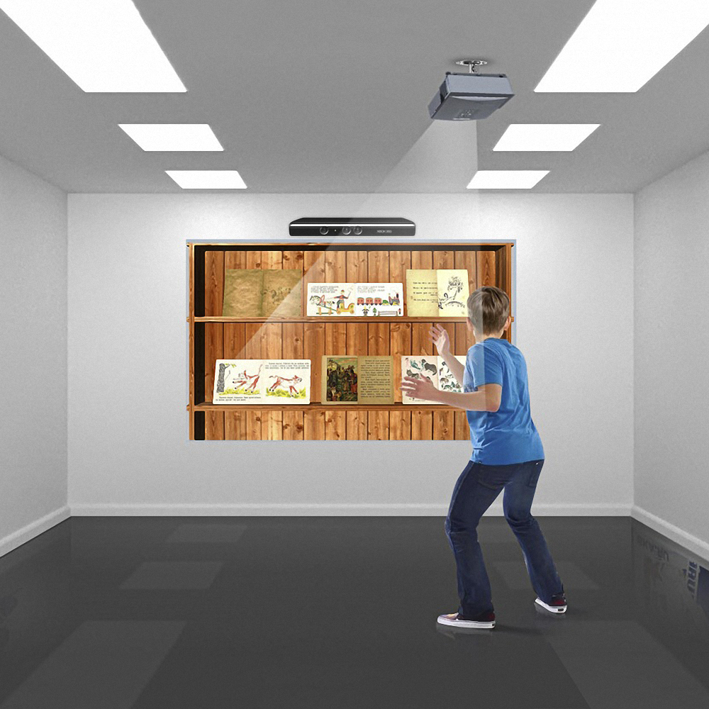 Проекционная интерактивная книга – это виртуальная библиотека с 3D книгами. Когда человек подходит к виртуальной полке, все книги оживают. Любой посетитель, управляя движениями, может выбрать и прочитать понравившийся экземпляр книги.