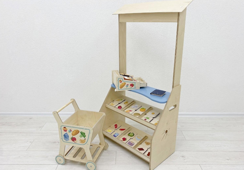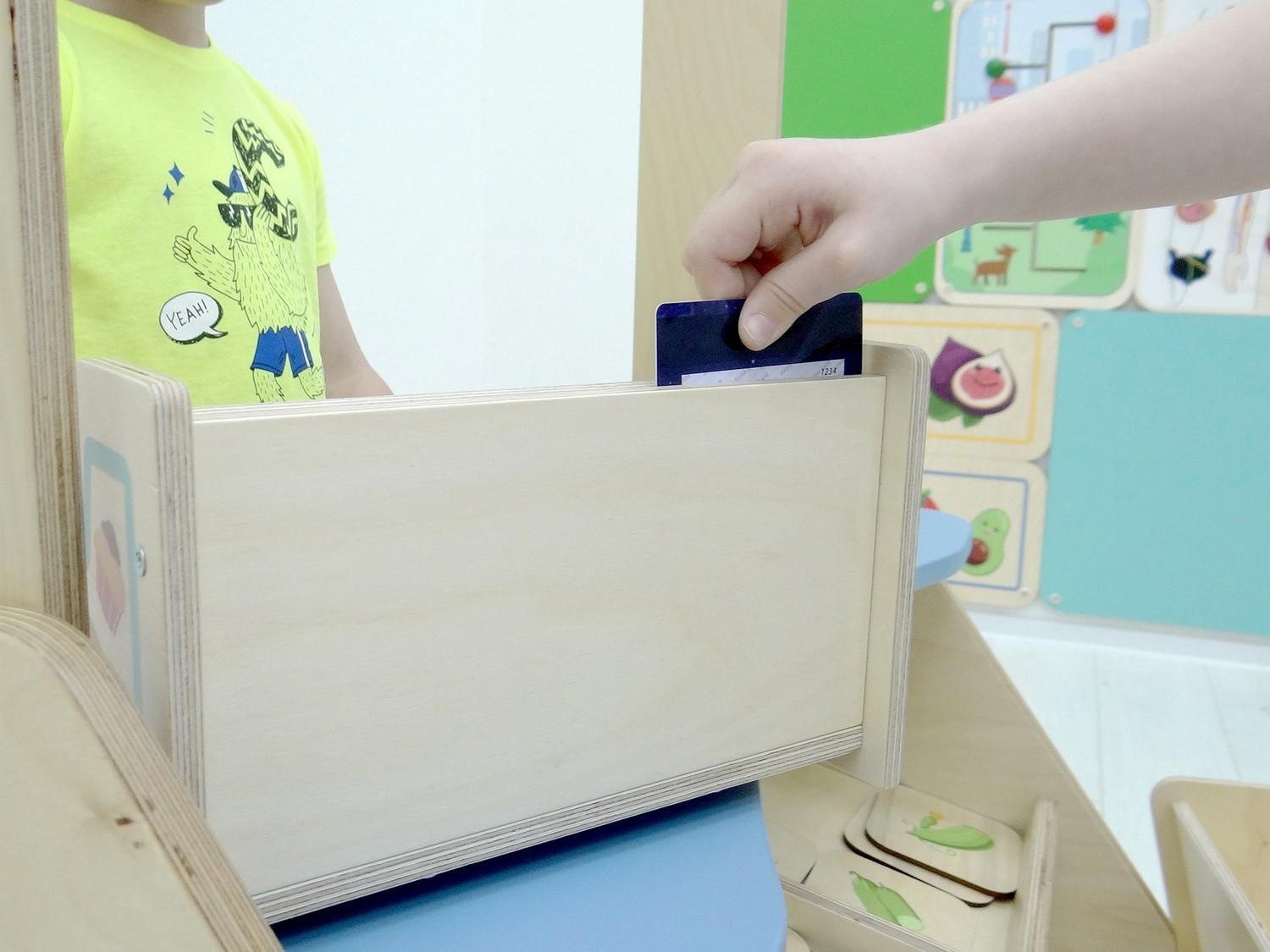 Дидактические игры: детский киоск «Магазин» с кассой, тележкой и продуктами. Макеты денег и пластиковые карты, копилки, кошельки, наборы для групповых игр по усвоению навыков финансовой грамотности на практике.