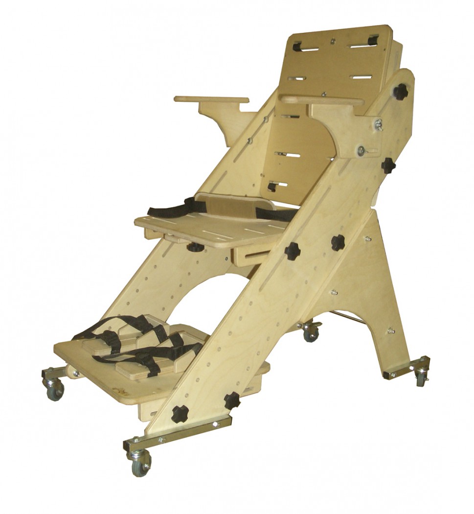 Опора для сидения предназначена для реабилитационных мероприятий с детьми с ограниченными возможностями, с патологиями различной степени тяжести, в том числе ДЦП. Представляет собой регулируемое ортопедическое кресло на металлической колесной основе. Рама опоры изготовлена из высококачественной фанеры со стойким противоаллергенным покрытием, расположена на металлической колесной основе. Колеса поворотные, все оснащены тормозами.
