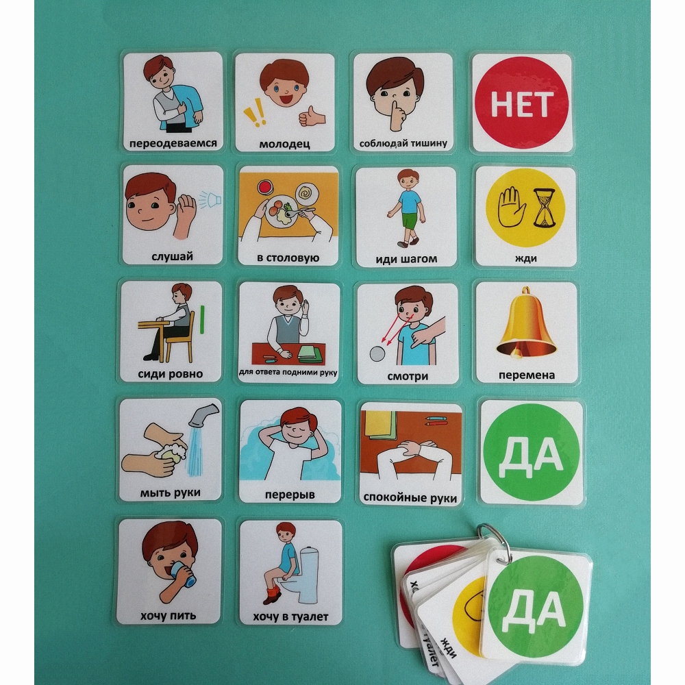 Педагогам и тьюторам может пригодиться визуальный БРЕЛОК, в котором собраны самые необходимые карточки. Например, чтобы показать ученику "соблюдай тишину" или "иди шагом". Иногда это может быть эффективнее, чем вербальные напоминания.