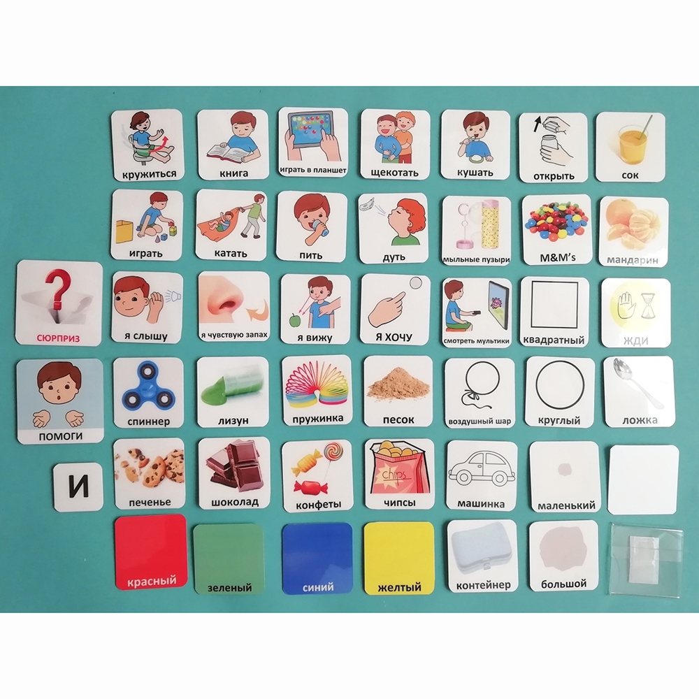 "Стартовый набор" карточек разработан таким образом, что в нем есть все карточки, которые описаны по всем 6 этапам работы методики PECS.