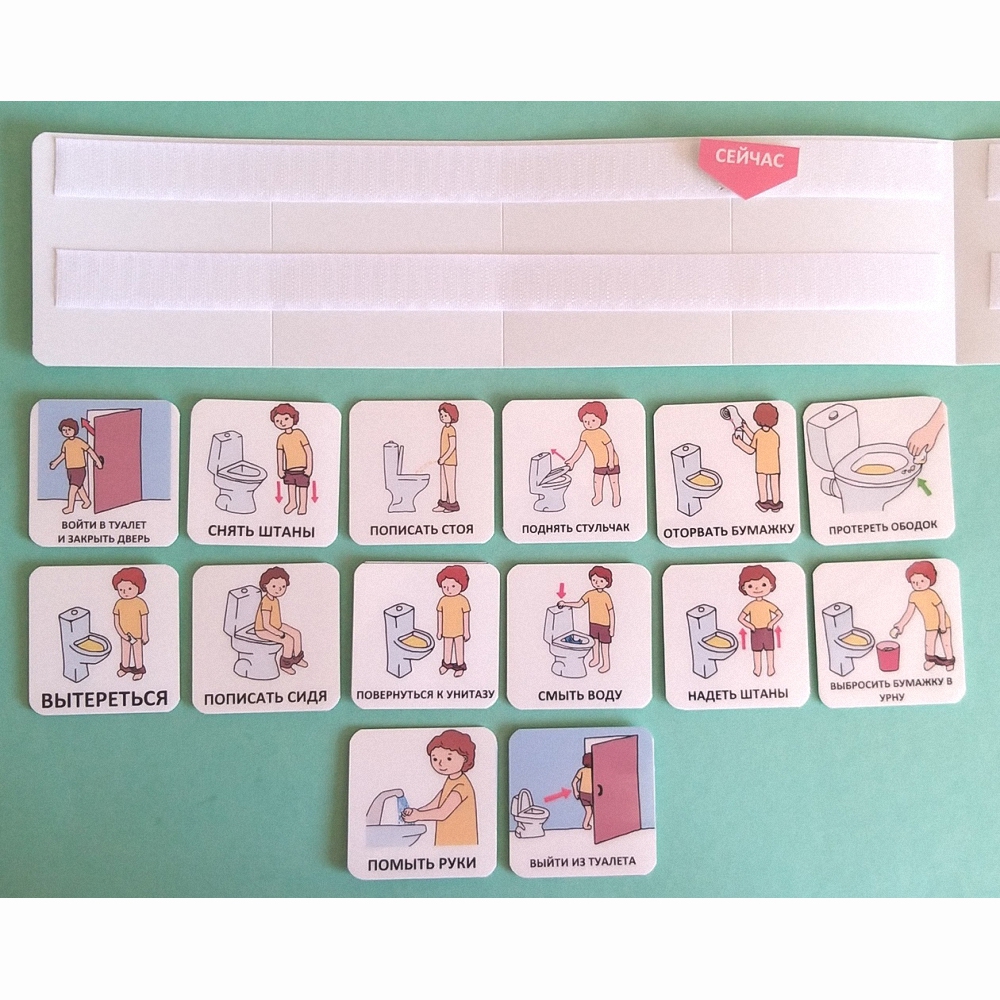 Самостоятельность в туалете - очень важный навык. Визуальная последовательность поможет как на ранних этапах обучения - пояснит какие действия нужно выполнять. И может остаться в качестве подсказки тогда, когда навык будет освоен.
