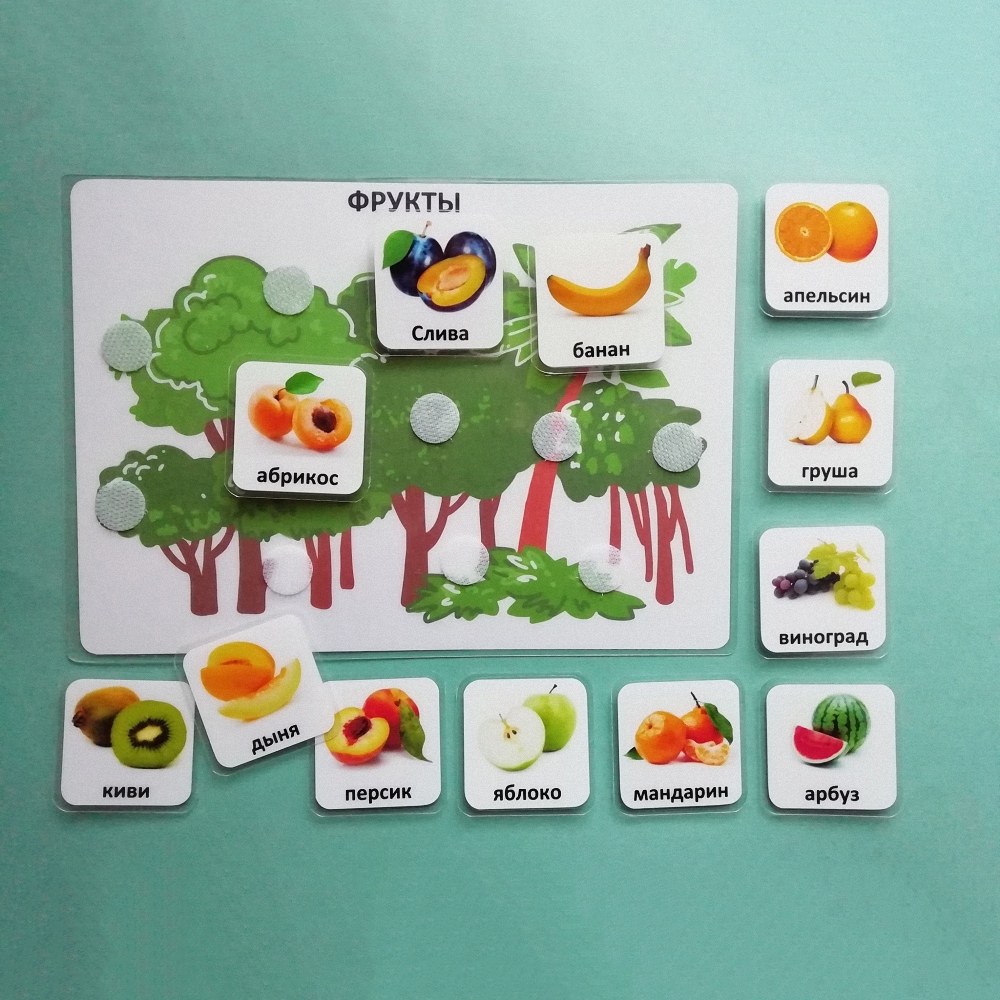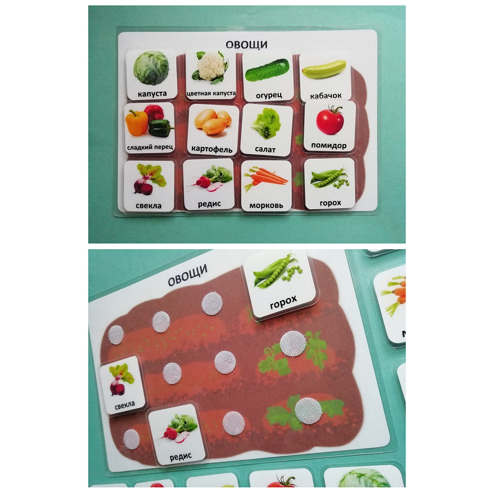 Наборы карточек "Овощи" (12 шт.) и "Фрукты" (12 шт.) размером 4 на 4 см входят в комплект.