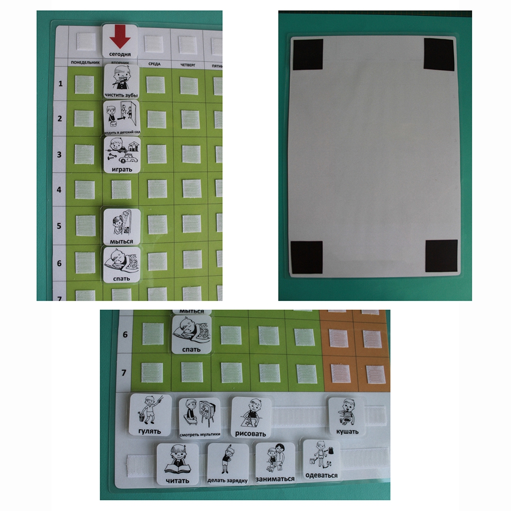 Расписание на неделю поможет дошкольникам и младшим школьникам ориентироваться в делах, которые запланированы на неделю. В верхней строке есть индикатор "сегодня". Две нижние строки служат для хранения не используемых на данный момент карточек. В столбце выстраиваются карточки предстоящих дел.
