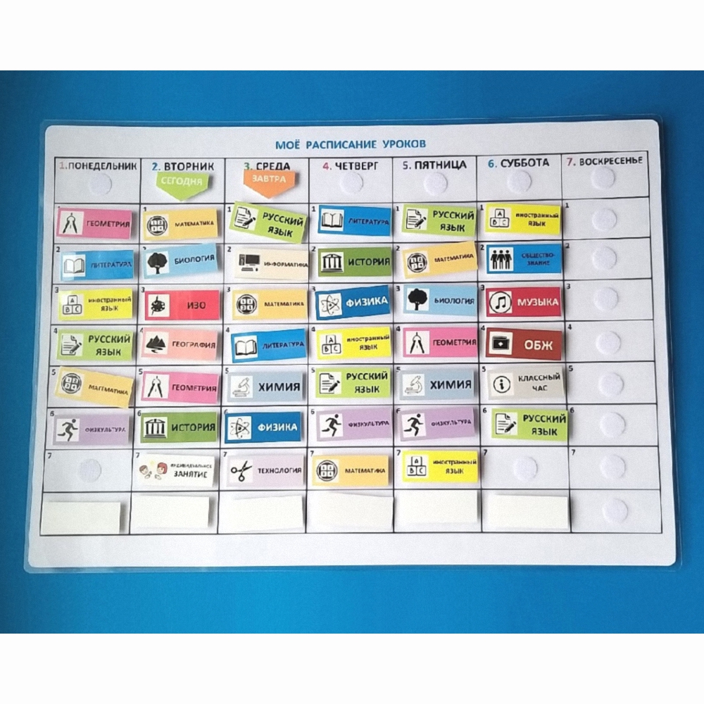Расписание со съемными карточками-уроками всегда будет показывать актуальную информацию, потому что внести необходимые изменение не представляет труда - просто перенести карточку. На расписании расположены жесткие липучки, на карточках мягкие. Все карточки выполнены из прочного водостойкого пластика, они прослужат очень долго. На них можно наклеивать необходимые изменения, на пустых карточках можно писать маркером.