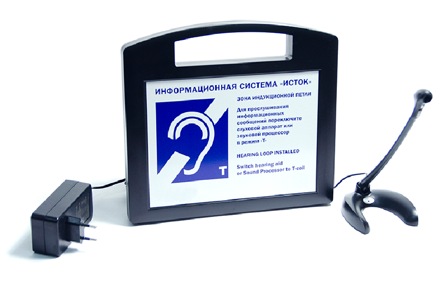 Портативная информационная индукционная система «Исток А2» с радиомикрофоном на стойке и встроенным плеером для проигрывания предварительно записанных сообщений.