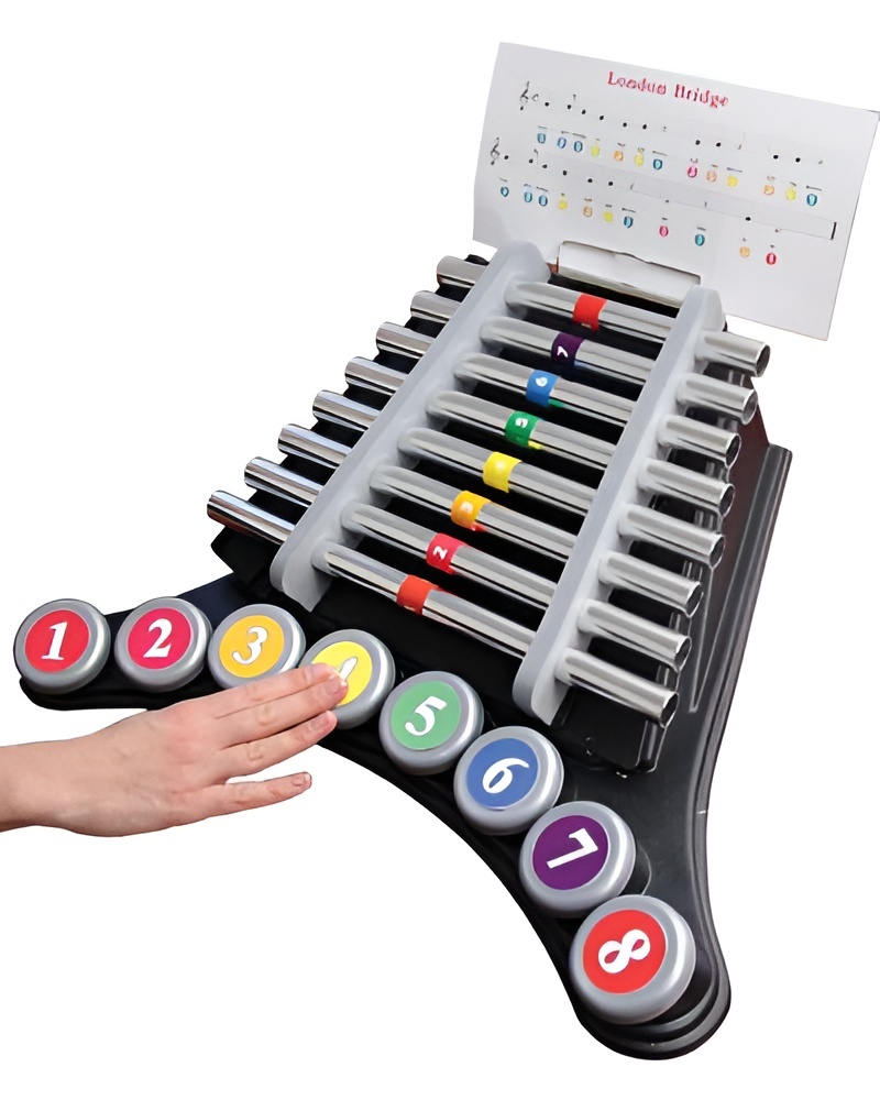 Адаптированный ксилофон. В комплекте идут карточки с песнями, которые можно сыграть самостоятельно, нажимая на соответствующие цветовые кнопки. Также можно прослушать заранее записанные песни.