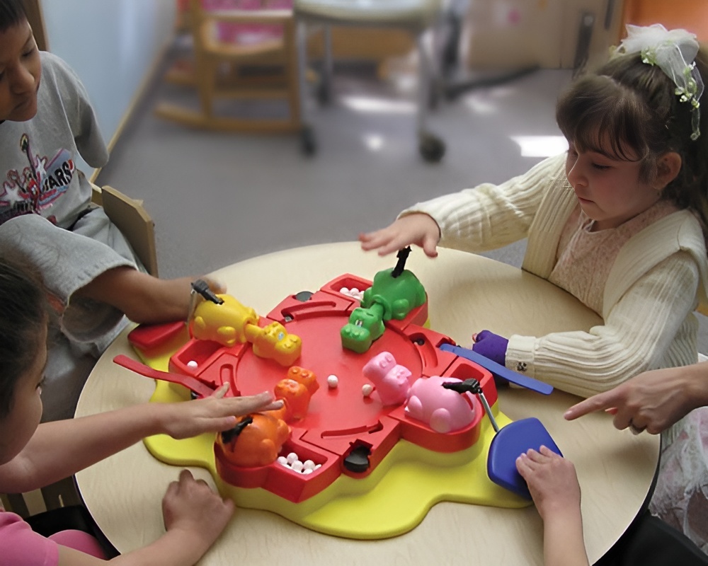 Адаптированная игра "Голодный гиппопотам" доставит ребенку много радости и веселья. Для того, чтобы играть было легко и непринужденно, два из четырех гиппопотамчиков имеют специальные адаптированные переключатели.