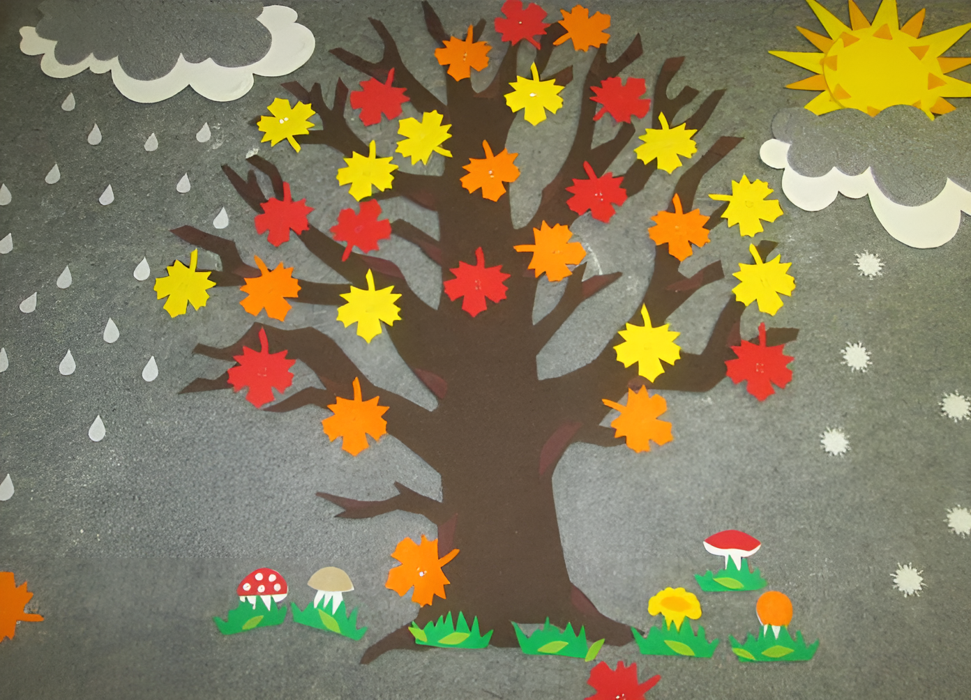 В состав набора входит поле, на которое на липучках прикрепляются ствол дерева, листья, грибы, дождик, солнце, облака.