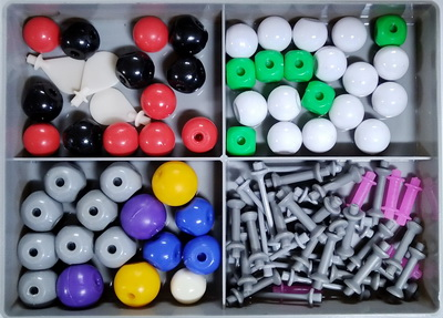 В комплект для составления объемных моделей молекул входят пластмассовые шары разного цвета. На них имеются отверстия для соединительных стержней. Отверстия на моделях атомов расположены таким образом, что при сборке моделей молекул соблюдаются углы между химическими связями. В приведенной таблице указано, какими шарами обозначен тот или иной химический элемент в комплекте (также для составления различных моделей молекул можно добавлять необходимые отверстия для дополнительных соединений):