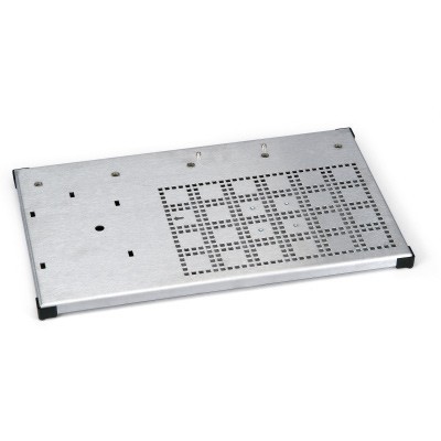 Неопрокидывающееся основание из нержавеющей стали с пятью специальными резьбовыми отверстиями для установки стоек без наклона, с резьбовыми отверстиями для установки разборного трансформатора и несколькими расширительными гнездами для установки элементов электрических схем. Имеет нескользящие резиновые ножки.