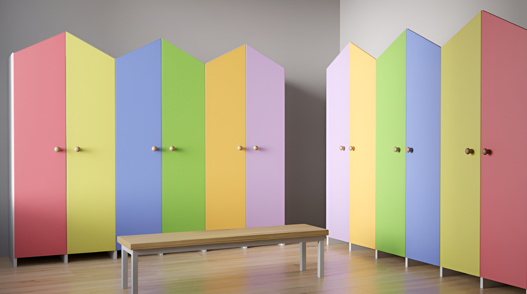 Детский гардероб — универсальные стеллажи для детей разных возрастов, выполнены в виде парных домиков, которые оснащены элементами в виде крючков, нескольких полок для складывания одежды и обуви. Дети могут самостоятельно, без помощи взрослых, складывать свои вещи в шкафчик, развивая самостоятельность. Данная модель гардероба выступает как специализированная мебель для детей, а главное может стать полезным дополнением к полноценному гардеробу в интерьере детского центра, детского сада, а также подойдет для специальных школ и интернатов.