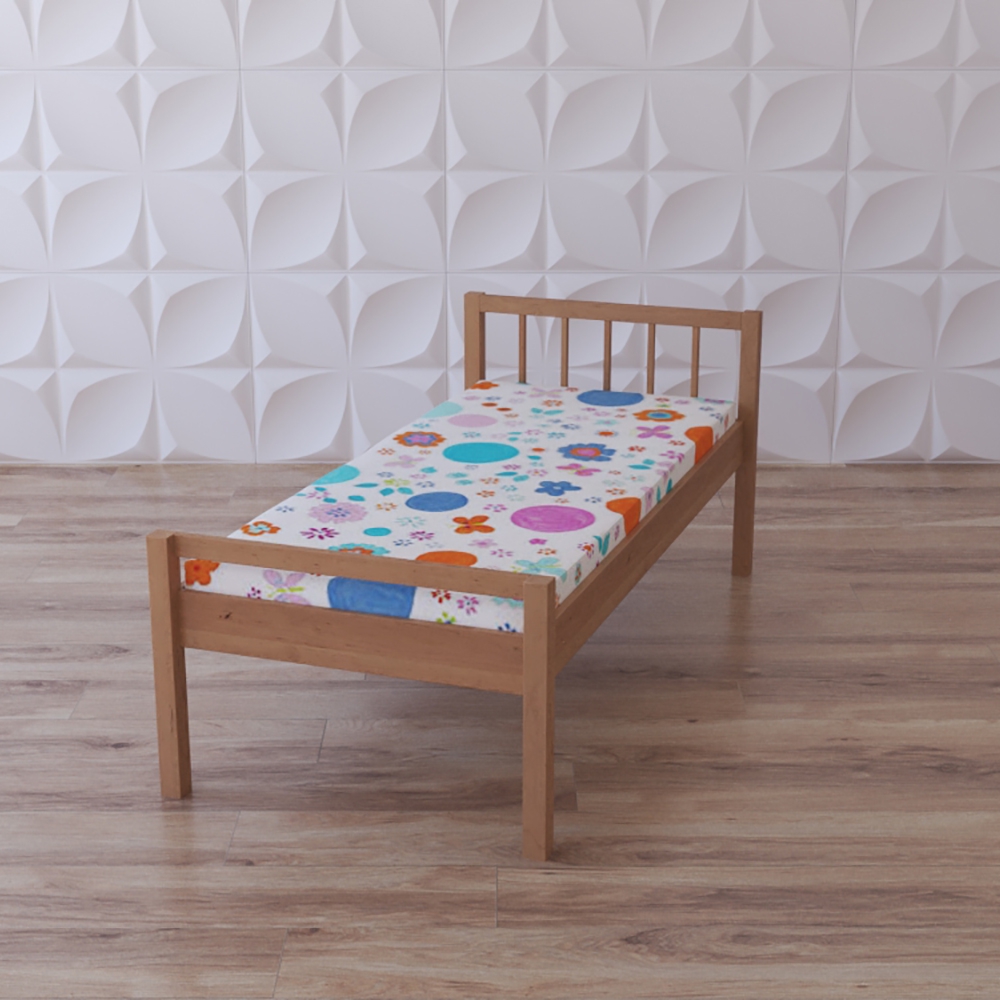 Кровать детская односпальная, может быть натурального цвета древесины или окрашенной; имеет простую лаконичную прямоугольную форму с двумя спинками – изголовьем и изножьем – и четырьмя ножками. Мебельный модуль предназначен для оснащения групп ДОУ, развивающих центров, будет уместен и в использовании дома.