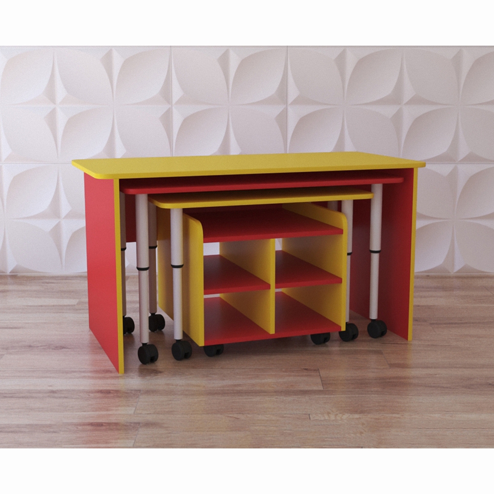 Многофункциональный набор столов “Один на всё” станет отличным решением для небольшого помещения и групповых занятий с дошколятами. Представляет из себя комплект из 4-х предметов мебели: самый большой стол имеет полностью деревянное основание, 2 поменьше – деревянные столешницы и телескопические ножки, а самый маленький предмет – тумбочка на колёсиках с четырьмя ячейками для хранения. Для чего нужно: прекрасно подойдёт для обустройства детской учебной зоны в группах ДОУ, коррекционном центре или реацентре, кабинете детского психолога или логопеда-дефектолога.