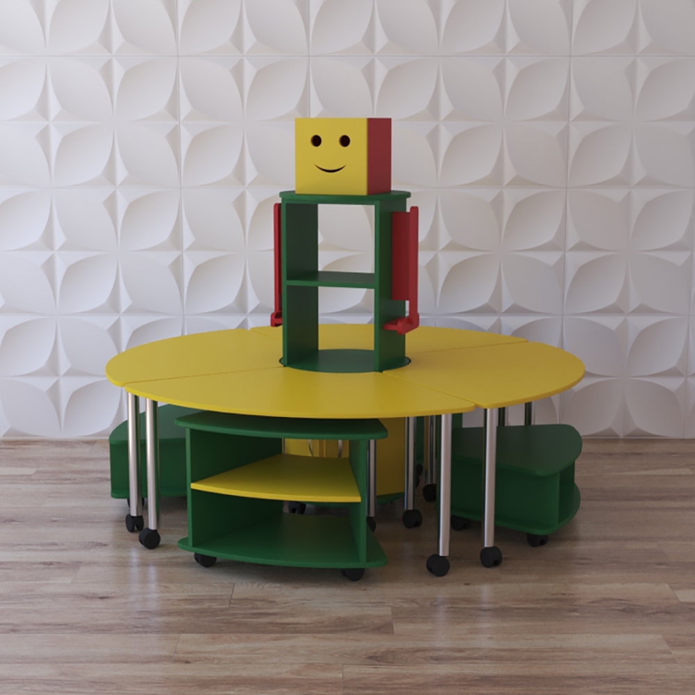 Многофункциональный стеллаж может использоваться как система хранения для учебного и игрового материала, а входящие в набор столы прекрасно подойдут для групповых занятий и игр.
