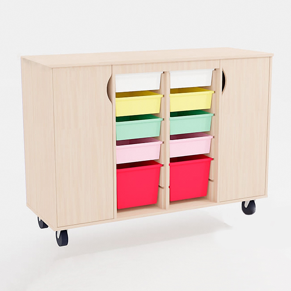 При производстве конструкции в качестве сырья используется ламинированная ДСП и ЛХДФ (лакированная древесноволокнистая плита высокой плотности). Они безопасны для детей, так как не выделяют токсичных веществ. В комплект входят 8 полипропиленовых контейнеров размером 420x300x100 мм, а также 2 контейнера из полипропилена с габаритами 420x300x230 мм. Для удобства перестановки мебели из помещения в помещения предусмотрены колесики.