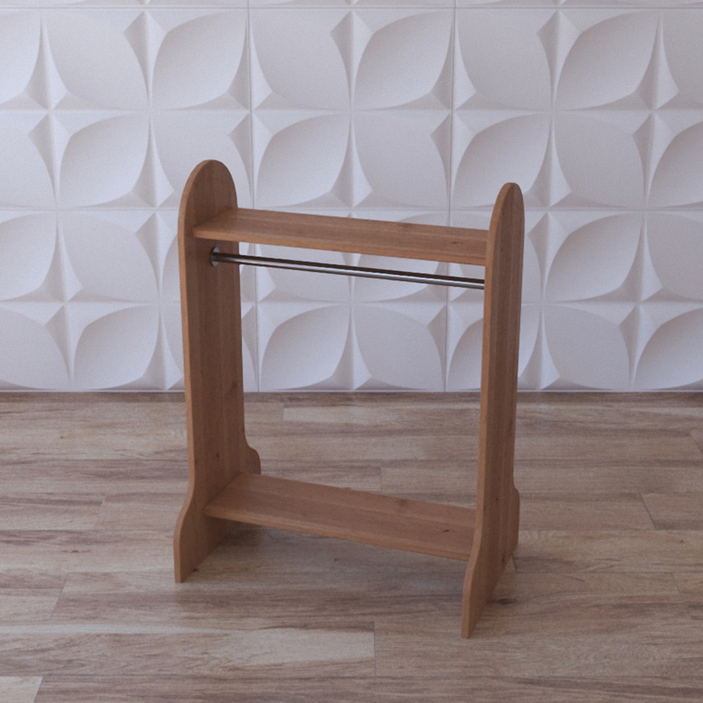 Вешалка напольная представляет из себя модуль из натуральной древесины, боковые панели окрашены в зелёный цвет либо цвет натуральной тёмной древесины; в составе модуля есть 2 деревянные полочки и металлическая штанга для вешалок-плечиков. Вешалка напольная детская может выступать в качестве игрового модуля для игровых групп в садиках и яслях.
