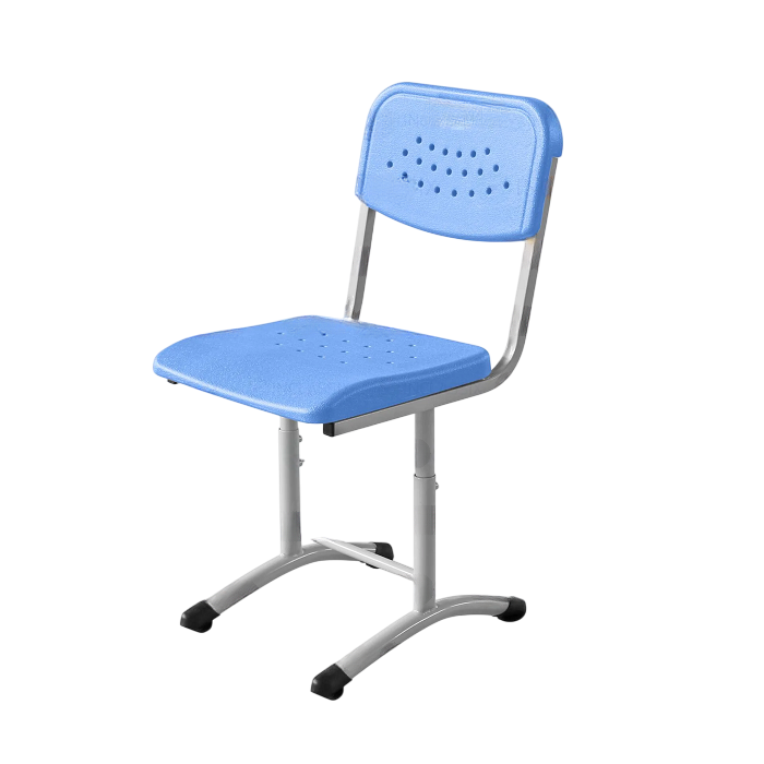 Школьный стул имеет стальной каркас, сиденье и спинку из утолщённого антивандального пластика.
