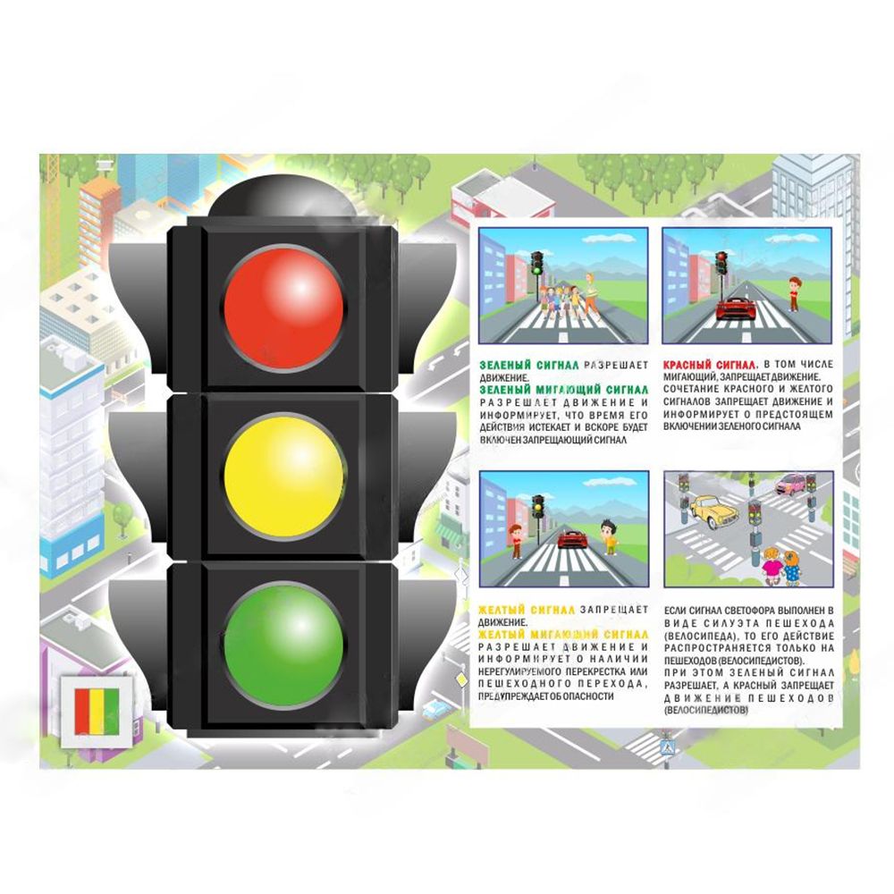 Стенд "Правила работы светофора" позволяет детям наглядно продемонстрировать порядок работы светофора на перекрестке.