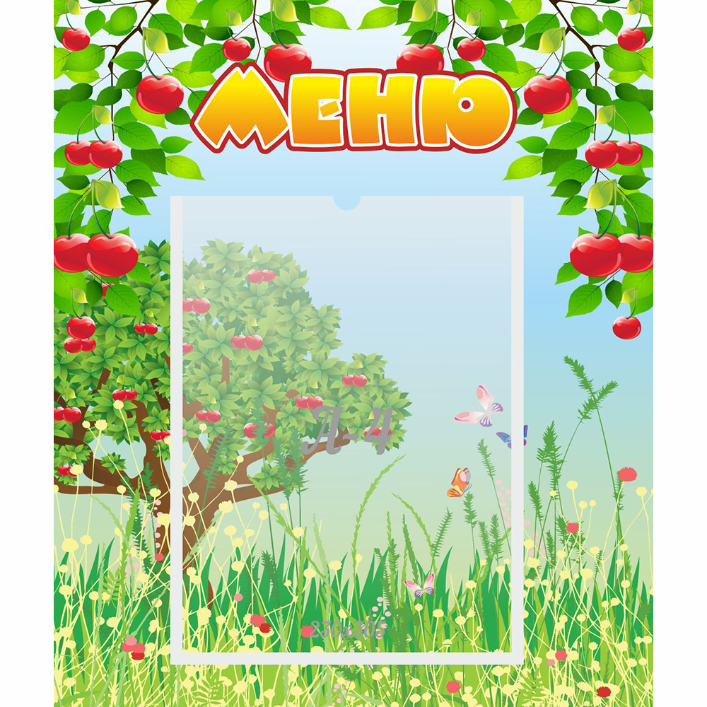 Яркий и необычный стенд, выбранный для ознакомления родителей с групповым меню. Детям разных возрастных групп предлагают разное меню, но этот стенд можно использовать в любой группе. Он отлично дополнит интерьер групповой комнаты. Кроме того его можно повесить на стене в раздевалке. Родители, приводя ребенка в садик, всегда будут видеть, чем собираются кормить их ребенка.