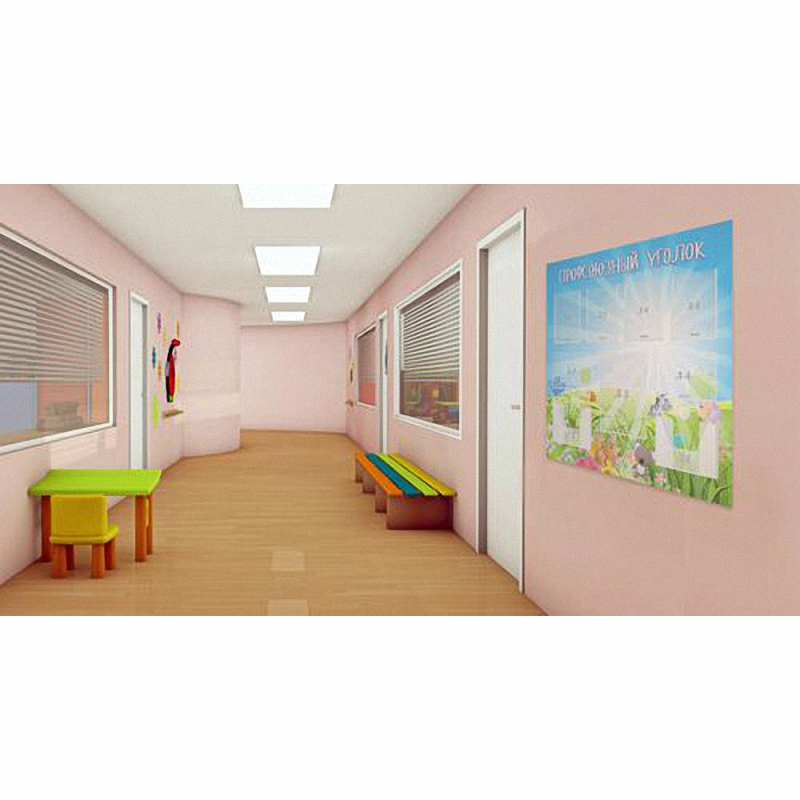 Фон стенда выполнен в светло-голубой гамме, пронизанной солнечными лучами, заголовок размещен верхней строкой. В нижней части картинки видны заросли травы и цветы, среди которых прячутся игрушечные звери. На этом стенде можно поместить информацию о членах профсоюза, актуальных вопросах, находящихся в его компетенции. Удобно будет подать материал про трудовые права коллектива, всевозможные льготы, способы их получения, необходимые документы, графики работы оздоровительных лагерей для детей сотрудников.