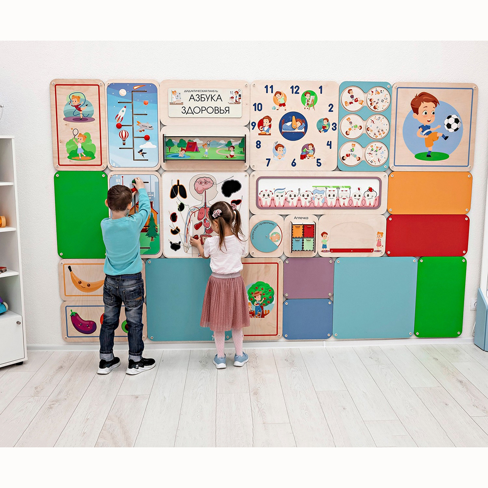 Дидактические панели отлично дополняю наборы цветных и иллюстрированных стеновых панелей, которые позволят оформить всё помещение в едином стиле.