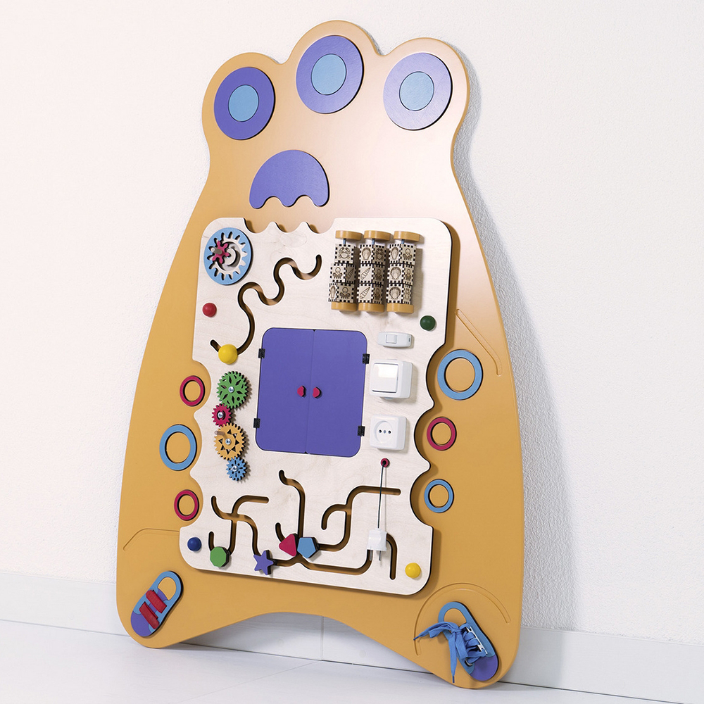 Развивающий сенсорный Бизиборд «Гвазго» украсит стену любого образовательного учреждения. Необычный внешний вид непременно привлечет внимание детей, а встроенные развивающие элементы займут надолго их внимание.