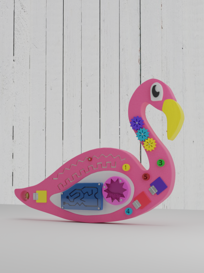 Бизиборд в виде розового фламинго украсит любую детскую комнату, а также игровую любого учреждения, что разнообразит занятия, улучшит память, мелкую моторику и мышление.