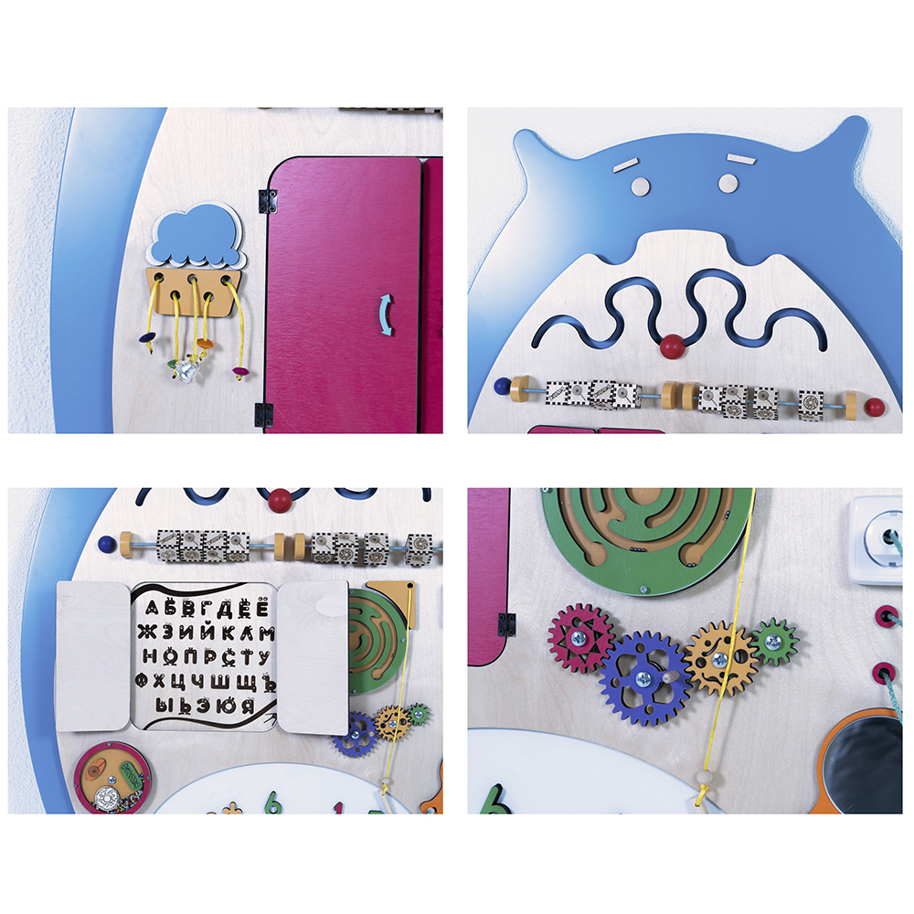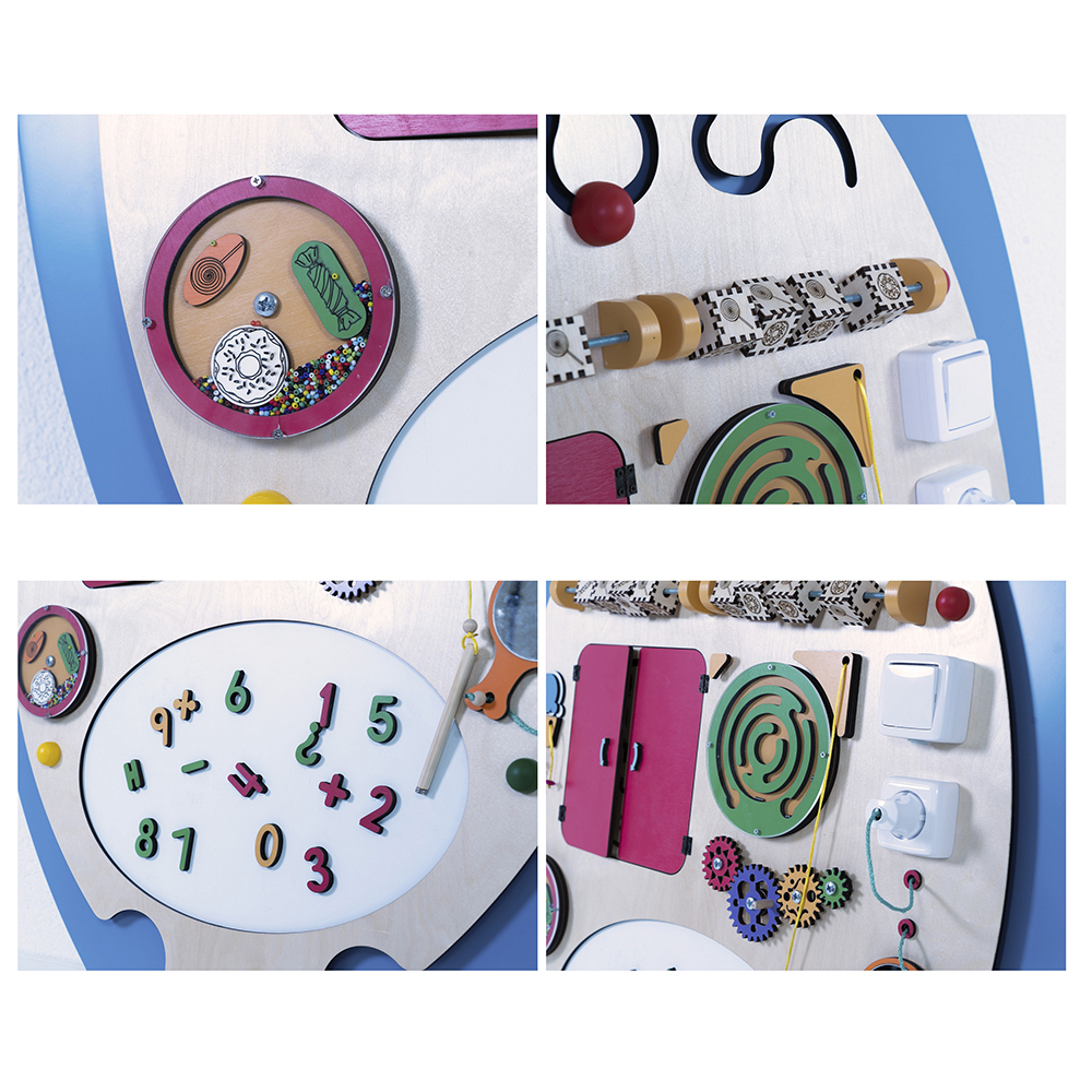Бизиборд «Зёва» для детских образовательных учреждений, необходим для изучения букв, цифр и магнитных свойств предметов. Задачи строятся по принципу «от простого к сложному». Например, освоив цифры, можно будет составлять из них примеры, и записывать получившийся ответ.