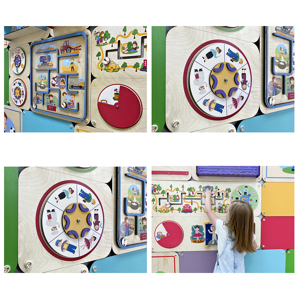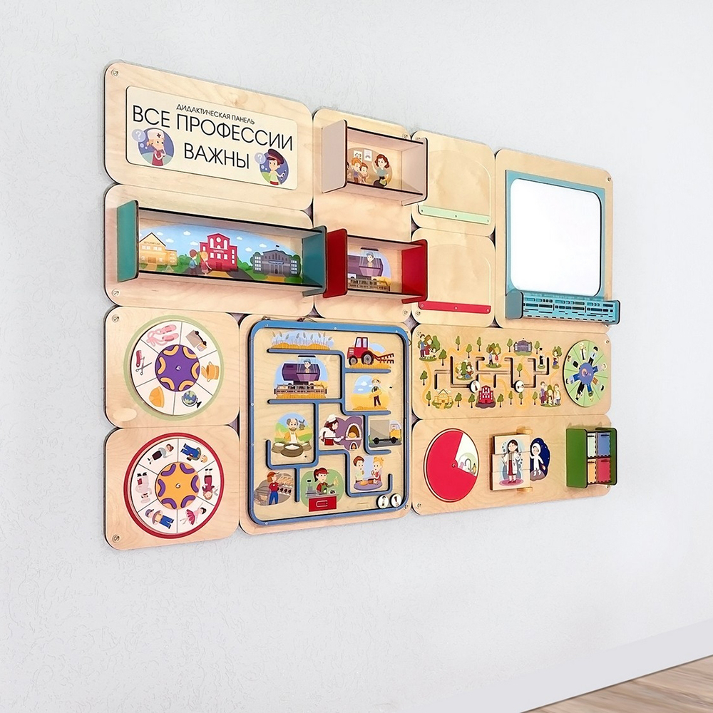 Панель знакомит с разными профессиями и важными этапами жизни человека, развивает логику и мышление, тренирует мелкую моторику и цветовосприятие.