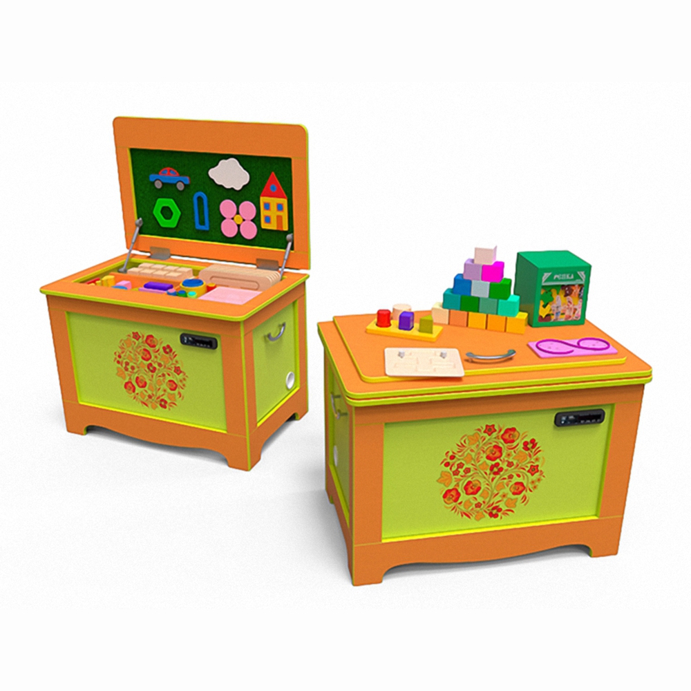 По внешнему виду комплекс напоминает сундучок. Он компактный, все предметы можно хранить прямо в нем. Изготовлен из экологичных материалов, не выделяет токсичных веществ. Отсутствуют острые края, что снижает риск получения травм.