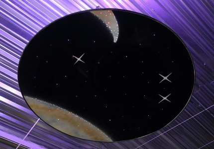 Модуль в виде темного круга, на котором выведены торцы волокон, создающие эффект "звездного неба" с летящими кометами и мерцающими звездами. Фон модуля напоминает космические туманности. С тыльной стороны - подсветка, имитирующая загадочное космическое сияние. Великолепное решение для оформления потолка сенсорной комнаты.