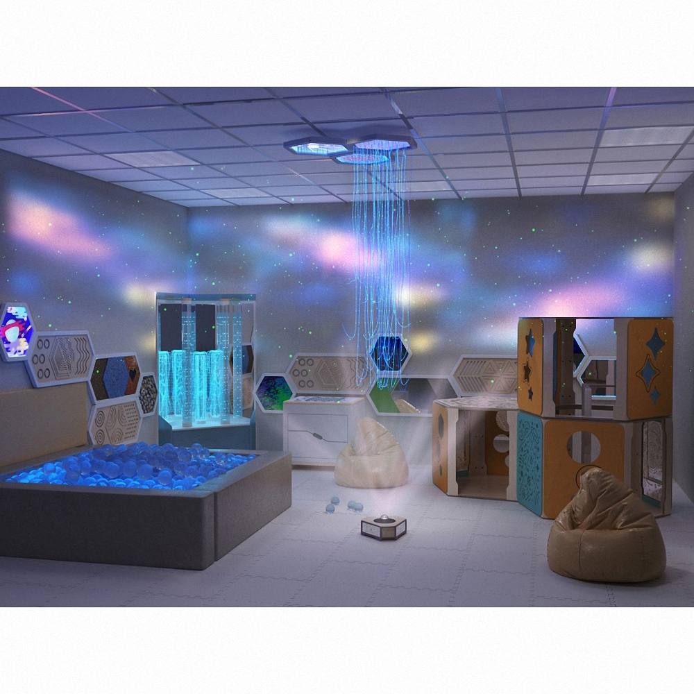 Для оформления потолка в сенсорных комнатах отлично подойдут потолочные панели. Шестигранные светильники мерцают в темноте словно иллюминатор, ведущий в глубины загадочного космоса. Это завораживает внимание малышей, нормализует работу нервной системы и успокаивает пульс, помогает расслабиться и отключится от тревожных мыслей. Потолочные панели имеют зеркальную поверхность и расположенную внутри светодиодную подсветку.
