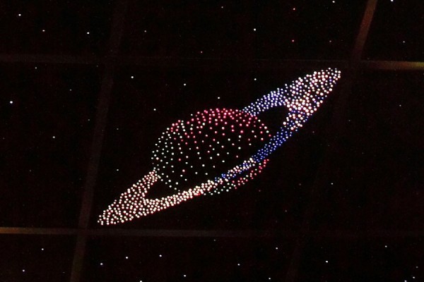 Несущая основа - плитка с бархатной черной поверхностью размером 120х60 см, которая идет как дополнительная плитка к образующим эффект «звездного неба». На плитке выложена планета Сатурн, вокруг которой реально вращается кольцо. Планета и вращающееся кольцо переливаются при этом разными цветами. В эффекте задействовано не менее светящихся 800 оптических волокон. Синхронизирующий светогенератор мощностью 50 вт установлен на плитке.