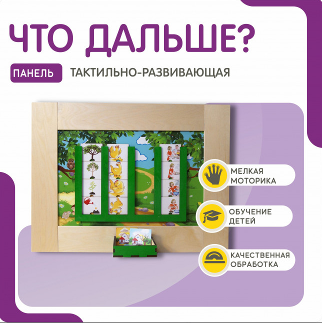 Модуль состоит из специальных пазов, в которые необходимо правильно поместить карточки с изображенными последовательными действиями. Ребенок должен рассортировать карточки не только по темам, но и в правильной последовательности.