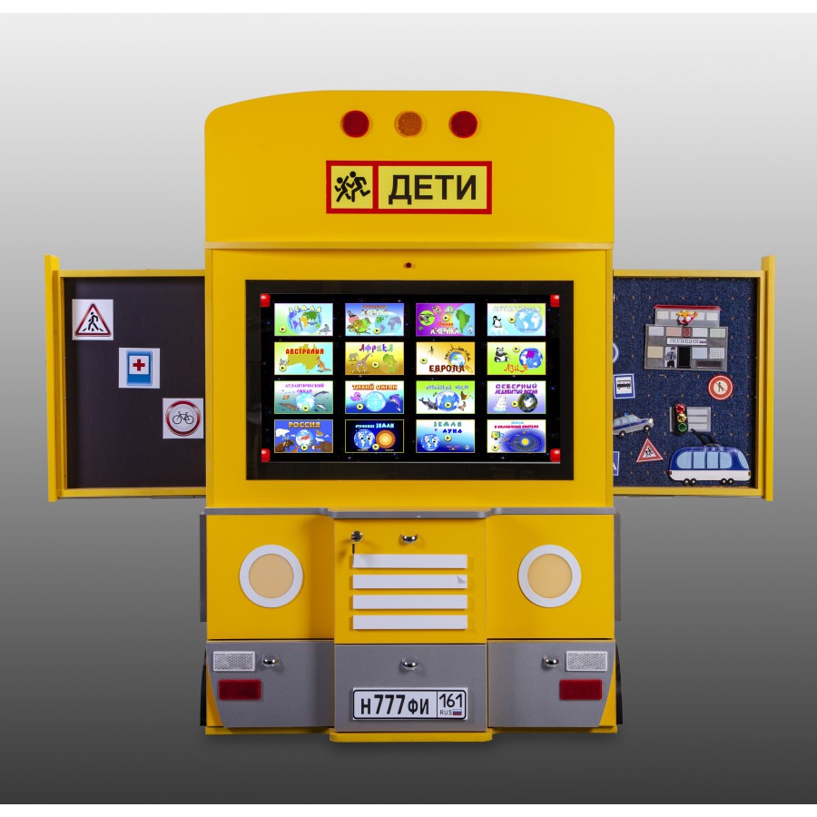 • Интерактивный комплекс «Автобус» представляет собой пристенный многофункциональный сенсорный модуль с ярким декоративным корпусом.