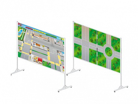 Двухсторонняя магнитно-маркерная доска представляет собой информационную панель на стойках, на лицевой стороне которой изображена "Азбука дорожного движения", а на оборотной – четырехсторонний перекресток и круговое движение.