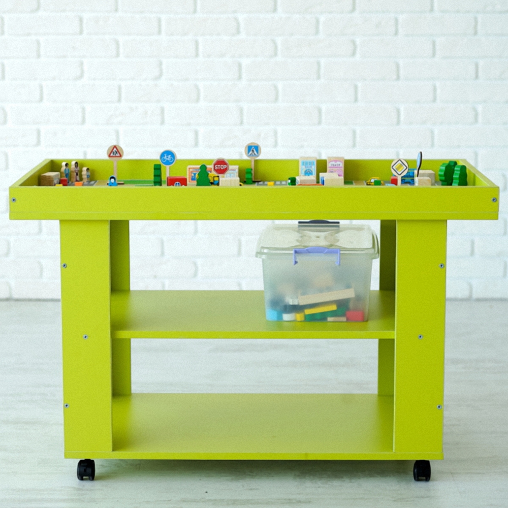 Чтобы убирать и хранить игрушки не в беспорядке предусмотрены контейнеры, которые в свою очередь, ставятся под столешницу, где установлены две полки. Доступ к ним рассчитан с четырех сторон.
